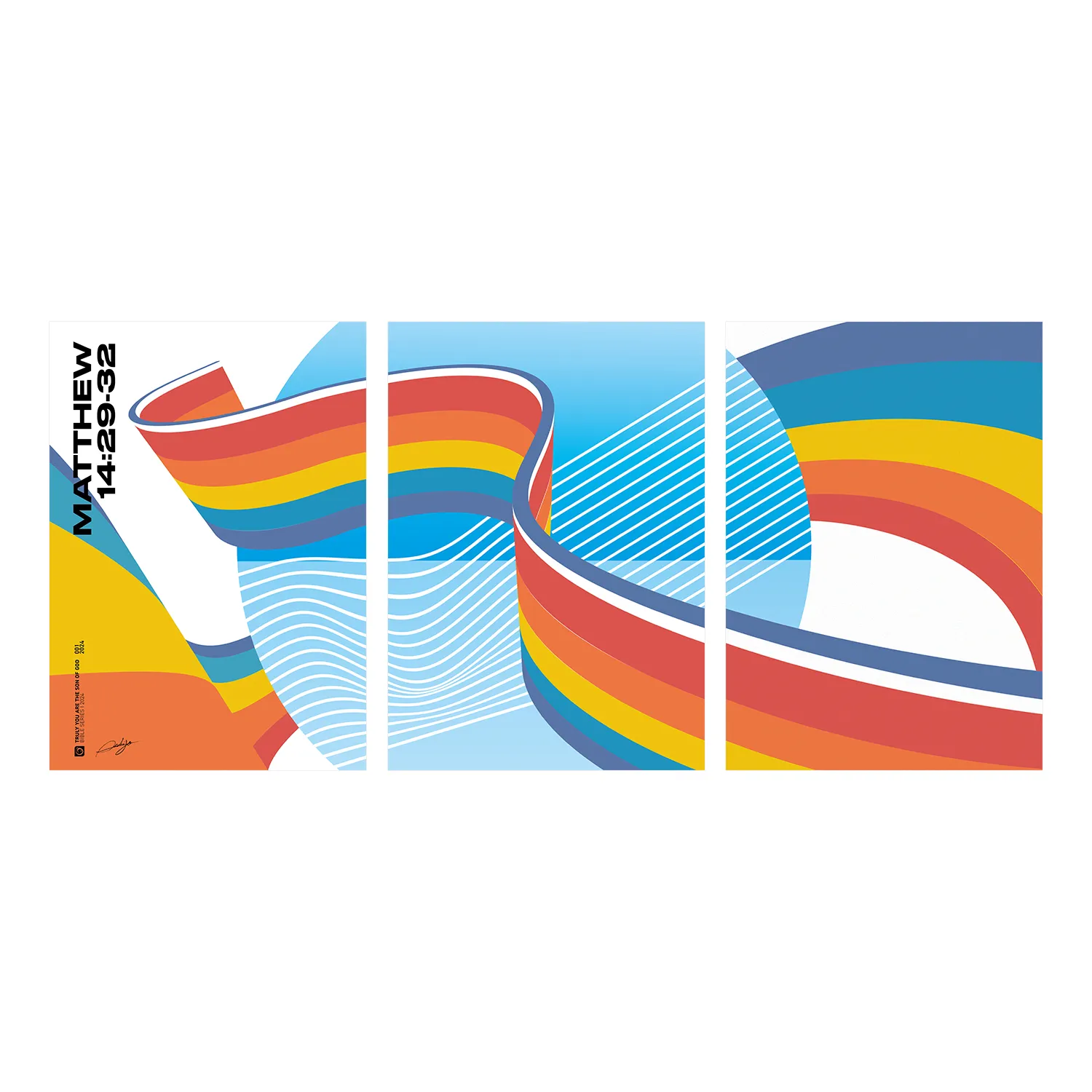 Questo poster illustra il momento in cui Pietro scende dalla barca per incontrare Gesù camminando sulle acque, simboleggiando la fede e l’incontro con il divino. Le linee e le sfumature di colore ritraggono un’atmosfera spirituale ricca di fede, movimento e colori.