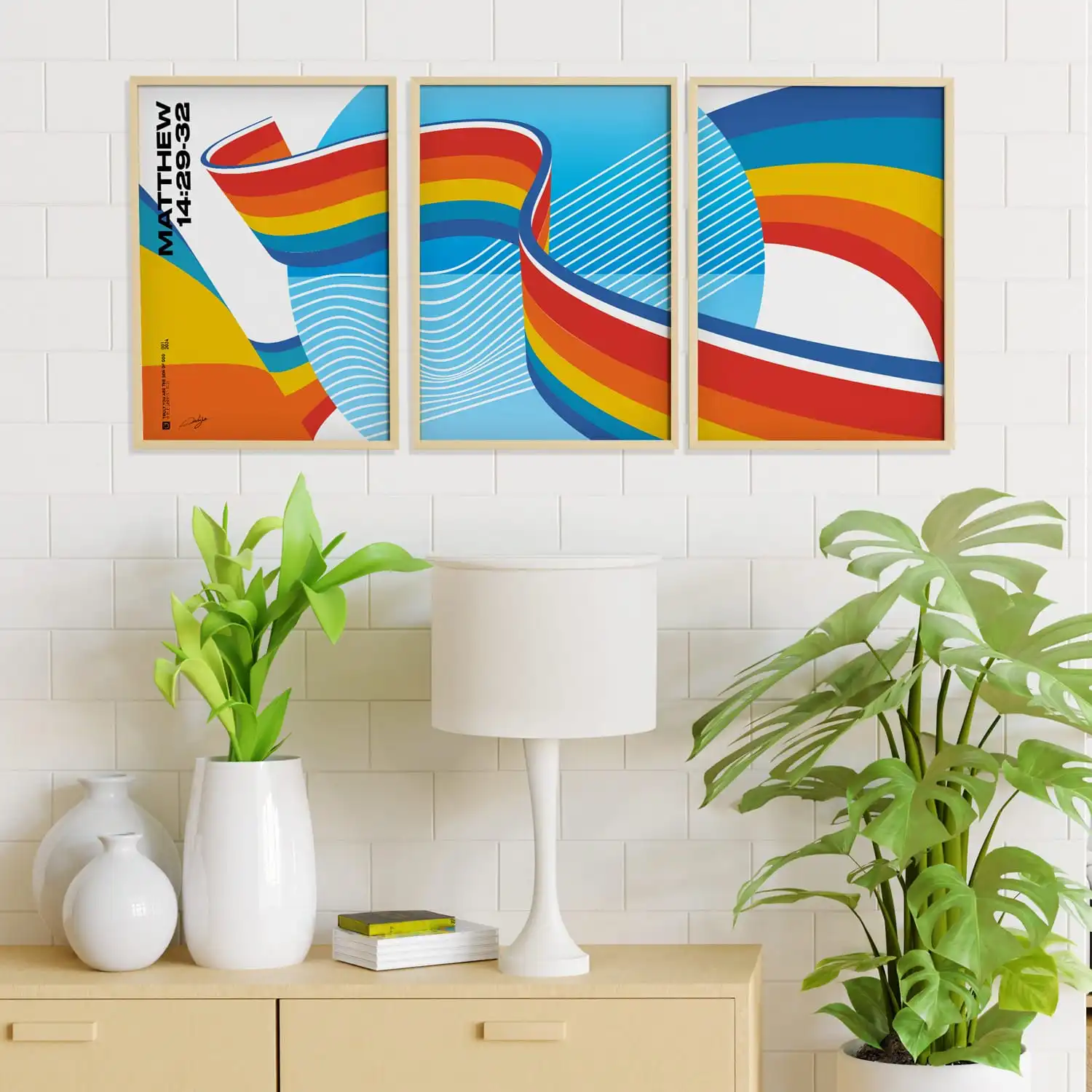 Este poster ilustra o momento em que Pedro desce do barco para encontrar Jesus sobre as águas, simbolizando a fé e o encontro com o divino. As linhas e nuances de cores retratam a atmosfera espiritual rica em fé, movimento, e cores.